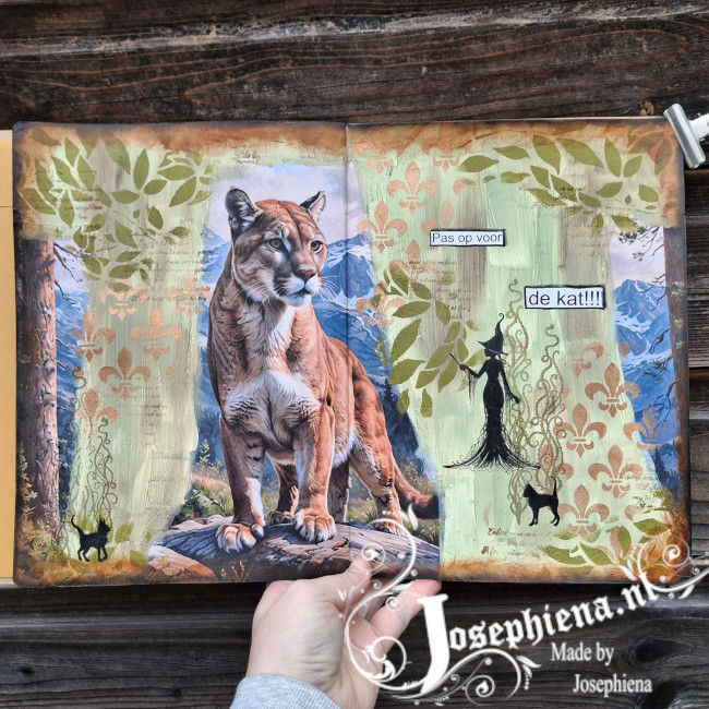 Een mooie art journal pagina gemaakt in het grote Dylusions Creative Journal. Voor deze pagina is de poema collage paper van Josephiena's Design gebruikt. Deze collage paper is gecombineerd met stencils van Josephiena's Design, Distress paint en Stempels van Lavinia Stamps. Met Cadence Dora Metal paint is een beetje glans aangebracht, langs de is Candence Distress past aangebracht om het geheel een kader te geven.