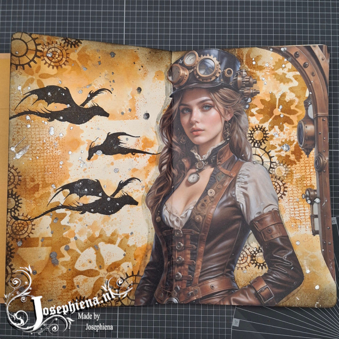 Een stoer voorbeeld met een van de dames uit de steampunk collectie van Josephiena's collage paper. De achtergrond is gemaakt met Distress inkt en een van Josephiena's Stencils. Daarnaast zijn er stempels van Lavinia Stamps gebruikt om de pagina af te maken. Scrol naar beneden voor een completer overzicht van gebruikte producten.