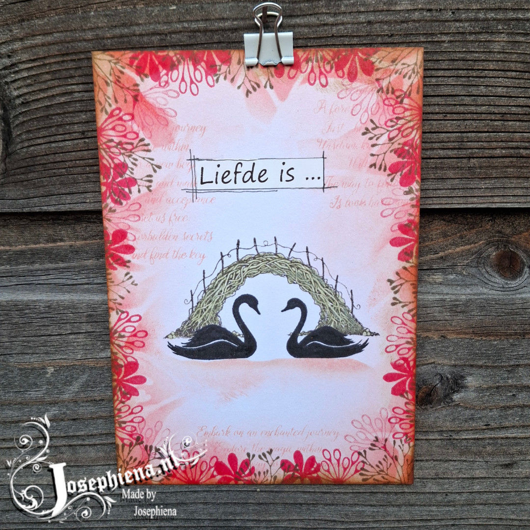 `Liefde is ...` een mooi voorbeeld voor een valentijnskaart. Voor de achtergrond is er een basis aangebracht met Distress ink `Saltwater Taffy`, door met de blendingtool van buiten naar binnen te werken en minder inkt in het midden aan te brengen. Vervolgens is met Distress ink `Abandoned Coral` en een stencil van Josephiena's een rand met bladeren patroon aangebracht. Om de achtergrond iets minder stijf te maken is er met een tekst stempel van Lavinia Stamps en Distress ink `Saltwater Taffy` wat tekst gestempeld hier en daar.