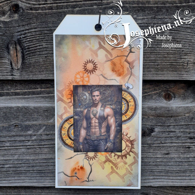 Een stoere tag, gemaakt met een van onze steampunk collage papers. De achtergrond is gekleurd met Dinkels van Lavinia Stamps.