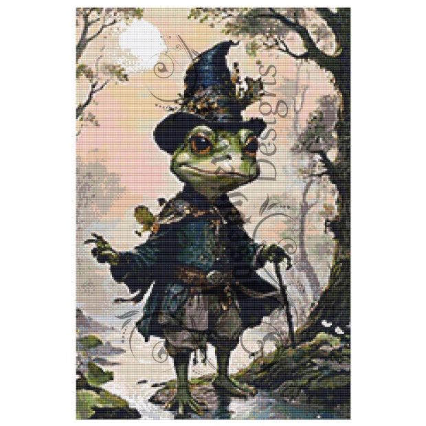 Deze diamond painting legt een moment in de tijd vast: een snapshot van een avontuur dat jou uitnodigt om mee te doen aan de pret. Onze avontuurlijke vriend is niet zomaar een gewone kikker; hij is getransformeerd tot iets buitengewoons met zijn eigen persoonlijke touch. De kikker staat trots boven op een rotsachtige uitstulping aan de rand van een sprankelende beek, met in zijn hand een staf die versierd is met betoverde voorwerpen die hinten naar de verhalen van deze fantastische wereld.